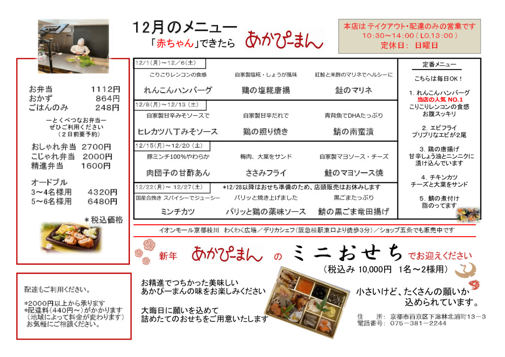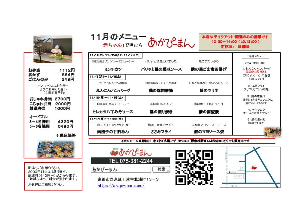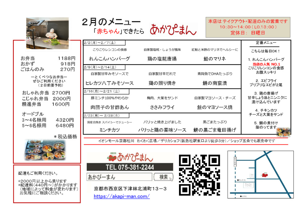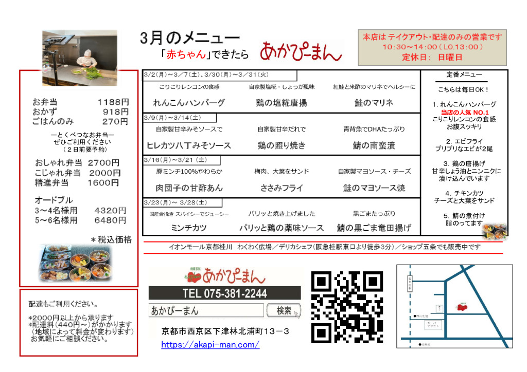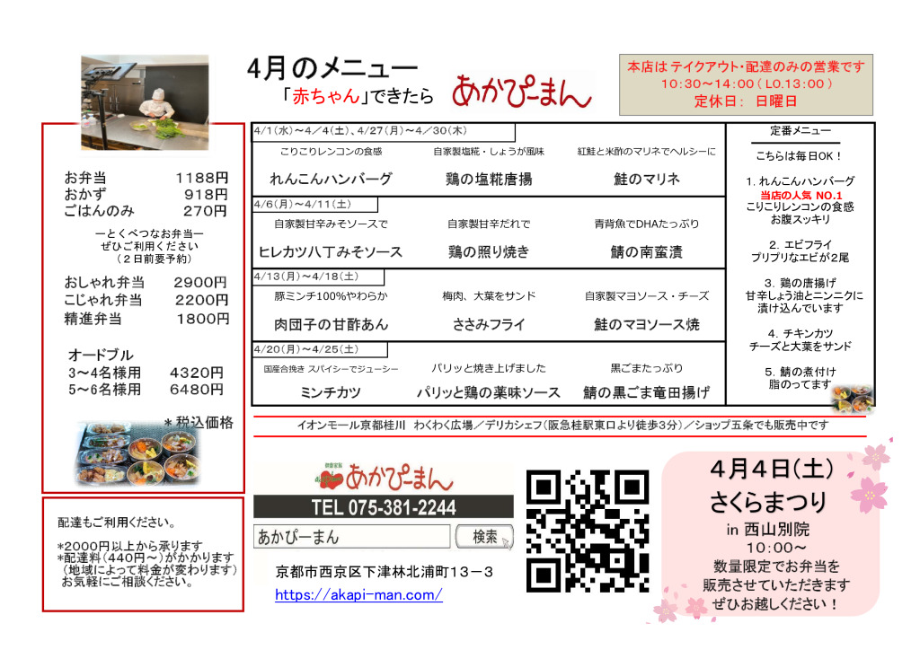 大切な家族のために、添加物などの含まれない安全なものをできる限り選んで食べさせたい…と心を込めて手づくりしています。「旬の素材」を使い、精進メニューを取り入れた、安全で身体にやさしい家庭の素朴な味のお料理です。"あかぴーまん"ならではのお母さんの味をぜひどうぞ。